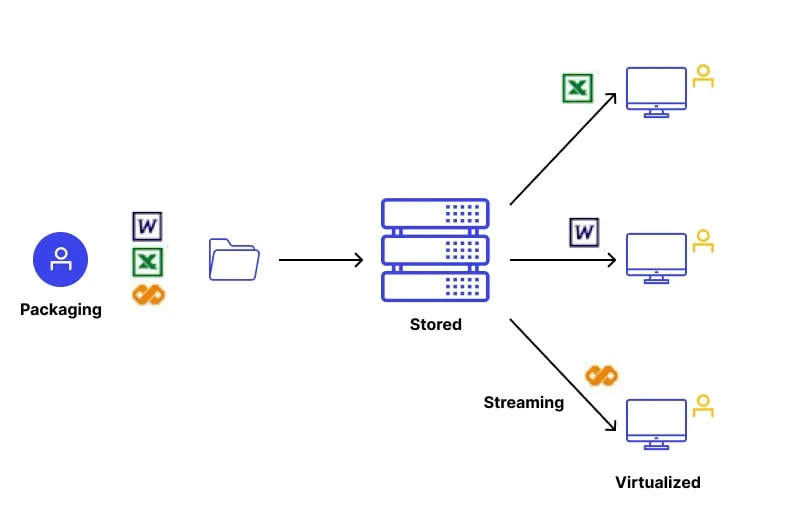 - Phát trực tuyến ứng dụng: Ứng dụng được truyền tải từ máy chủ đến thiết bị người dùng và chỉ khởi động khi được yêu cầu, giảm thiểu tài nguyên sử dụng cục bộ.