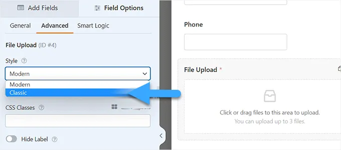 Tuy nhiên, nếu bạn có không gian hạn chế cho biểu mẫu của mình hoặc bạn muốn sử dụng một trường tải lên cổ điển, bạn có thể thay đổi điều này. Chỉ cần chọn tùy chọn “Classic” từ menu thả xuống “Style”.