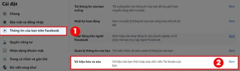 - Bước 3: Tại mục cài đặt, người dùng nhấn chọn “Thông tin của bạn trên Facebook”. Tiếp đó, nhấn vào chữ “Xem” nằm ở dòng “Vô hiệu hóa và xóa”.