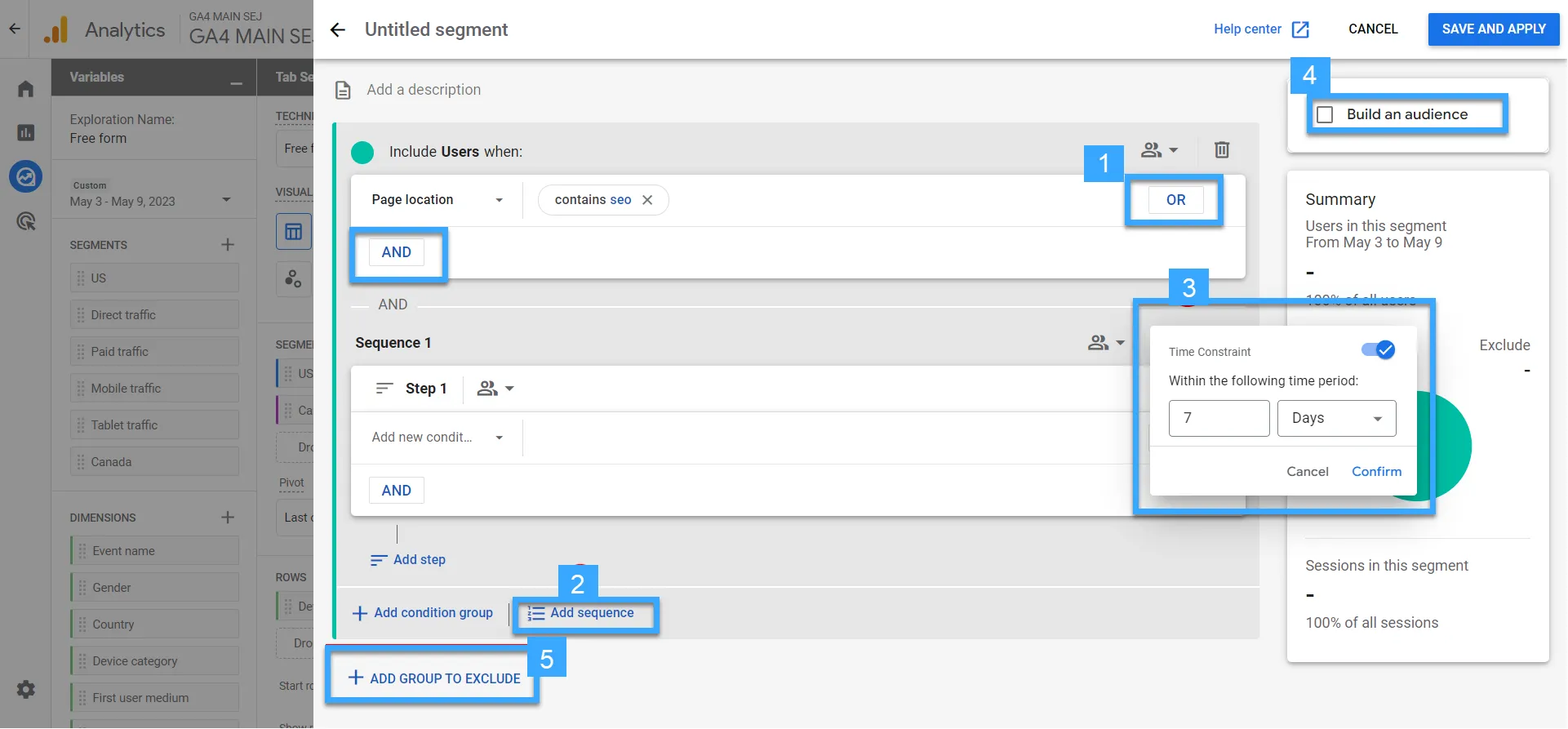Khám phá giao diện người dùng của trình khởi tạo segments audiences trong GA4
