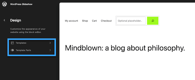 Theo mặc định, trình chỉnh sửa trang đầy đủ hiển thị home template của theme nhưng có thể chèn nội dung page vào bất kỳ khu vực nào. Để xem tất cả các tùy chọn có sẵn, chỉ cần chọn ‘Templates‘ hoặc ‘Template Parts‘.