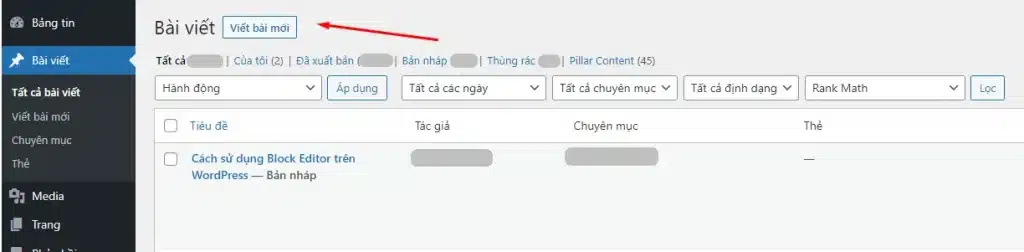 Trước tiên để tạo bài viết mới, tại giao diện Dashboard của WordPress bạn vào Bài viết > Viết bài mới để tạo bài viết và vào được giao diện Block Editor
