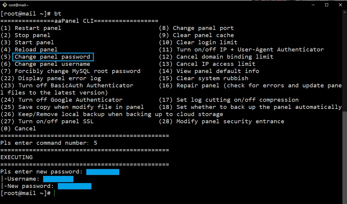 Sau khi truy cập vào máy chủ VPS của aaPanel thông qua SSH thành công, hãy nhập “bt” và tìm kiếm dòng Change panel password, dòng này nằm ở vị trí thứ 5 trong bảng menu.