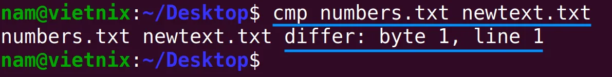 cmp -b newtext.txt numbers.txtKết quả: Terminal sẽ hiển thị danh sách các byte khác nhau giữa 2 file.