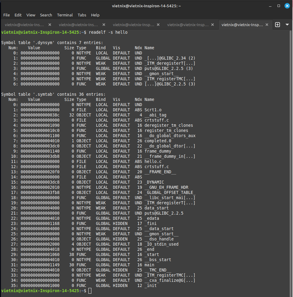 Sử dụng lệnh readelf -s <ten_tap_tin_ELF> để xem các biểu tượng (symbol) được định nghĩa và tham chiếu trong file ELF.
