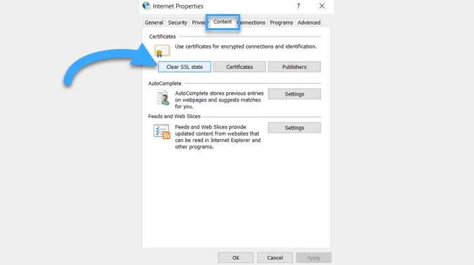 Bạn có thể mở ‘Internet Options‘ bằng cách tìm kiếm nó trong menu Start. Bây giờ hãy chuyển sang tab Content và nhấp vào nút ‘Clear SSL state‘.