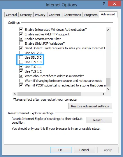 - Bước 2: Click vào tab “Advanced” rồi bỏ chọn SSL 3.0 và TLS 1.0.