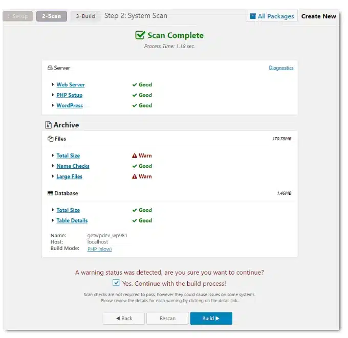 Plugin sẽ kiểm tra website của bạn bằng cách scan. Có thể có vài cảnh cáo được gửi đến, tuy nhiên bạn có thể bỏ qua chúng bằng cách chọn “Yes -> Build”.