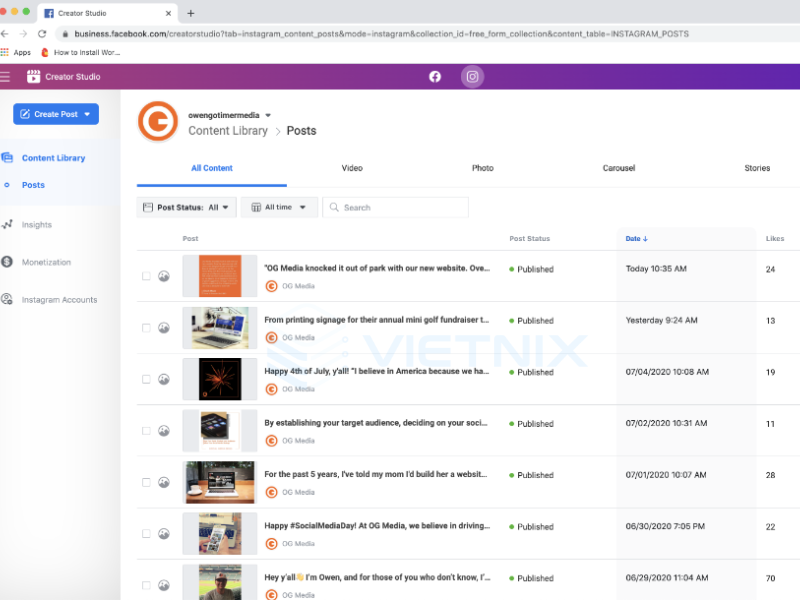 • Bước 5: Xem tất cả nội dung đã xuất bản trong Thư viện nội dung/Bài viết. Ngoài việc cung cấp danh sách nội dung đã xuất bản, Creator Studio còn cho phép bạn theo dõi và kiểm tra mức độ tương tác của nội dung thông qua phản ứng, nhận xét, chia sẻ,…