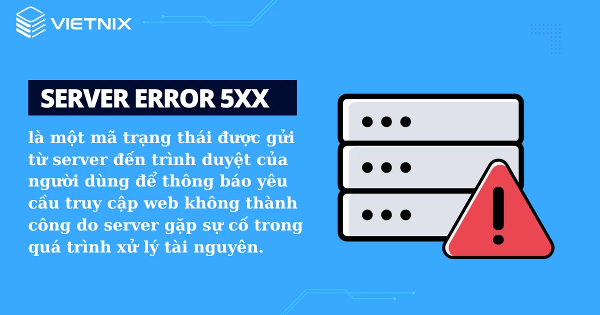 Server Error 5xx là một mã trạng thái được gửi từ server đến trình duyệt của người dùng để thông báo yêu cầu truy cập web không thành công do server gặp sự cố trong quá trình xử lý tài nguyên. Trong thông báo này, server cũng thông báo cho bên thứ 3 (thường là các công cụ tìm kiếm) về vấn đề kỹ thuật đã xảy ra gây nên tình trạng không khả dụng.