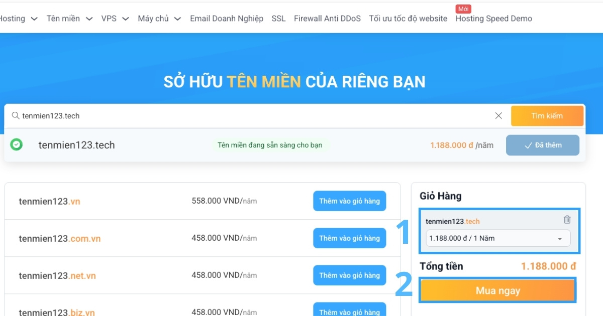 Bước 3: Hệ thống sẽ xử lý và trả về kết quả. Nếu tên miền vẫn có sẵn để đăng ký, một thông báo xác nhận sẽ xuất hiện. Lúc này, bạn nhấn nút Thêm vào giỏ hàng.