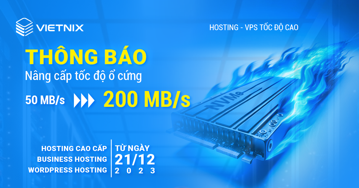 Với mục tiêu mang đến cho khách hàng những giải pháp lưu trữ tốc độ vượt trội, Vietnix thông báo kể từ ngày 21/12/2023, chính thức nâng cấp tốc độ ổ cứng từ Disk I/O Limit 50 MB/s lên 200 MB/s cho 3 gói dịch vụ: